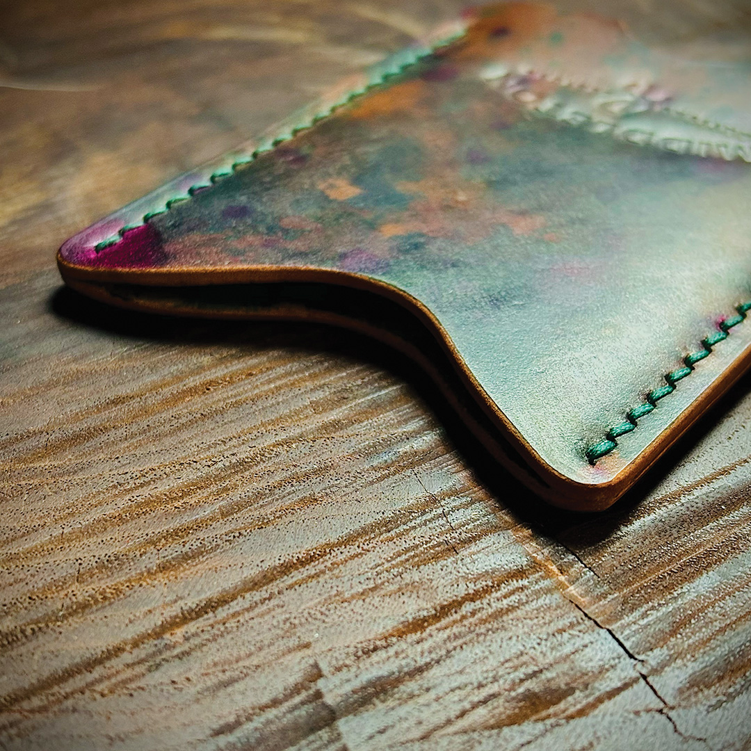 Each piece is cut from vegetable tanned leather and individually dyed, giving the surface a one-of-a-kind mix of earthy tones and subtle speckling. It’s then saddle-stitched by hand with durable thread and finished with smooth, burnished edges for a comfortable carry.