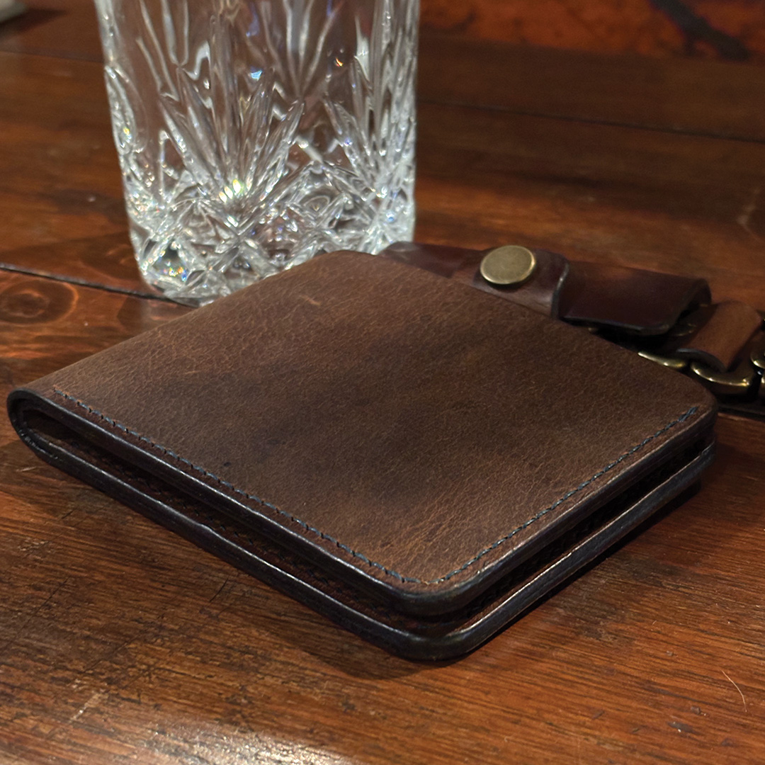 Each wallet is saddle-stitched by hand with green Meisi linen thread—a strong, waxed thread that locks every stitch in place. The traditional bifold layout feels familiar in the hand but is trimmed down to stay slim in the pocket, even when fully loaded.