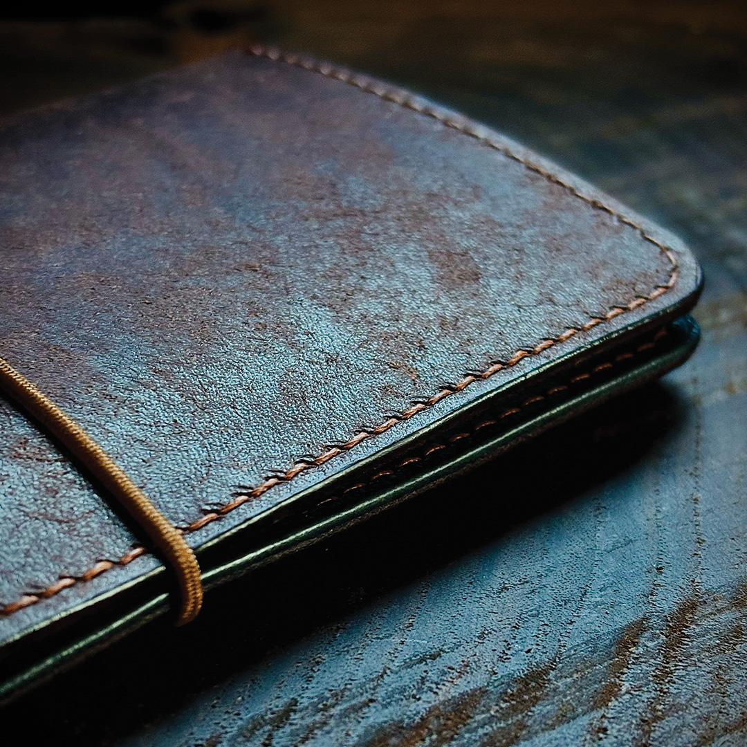 Field Notes Cover in Badalassi Pueblo and chèvre goat skin, with two card slots and elastic closure for a slim, durable everyday notebook wallet carry companion.